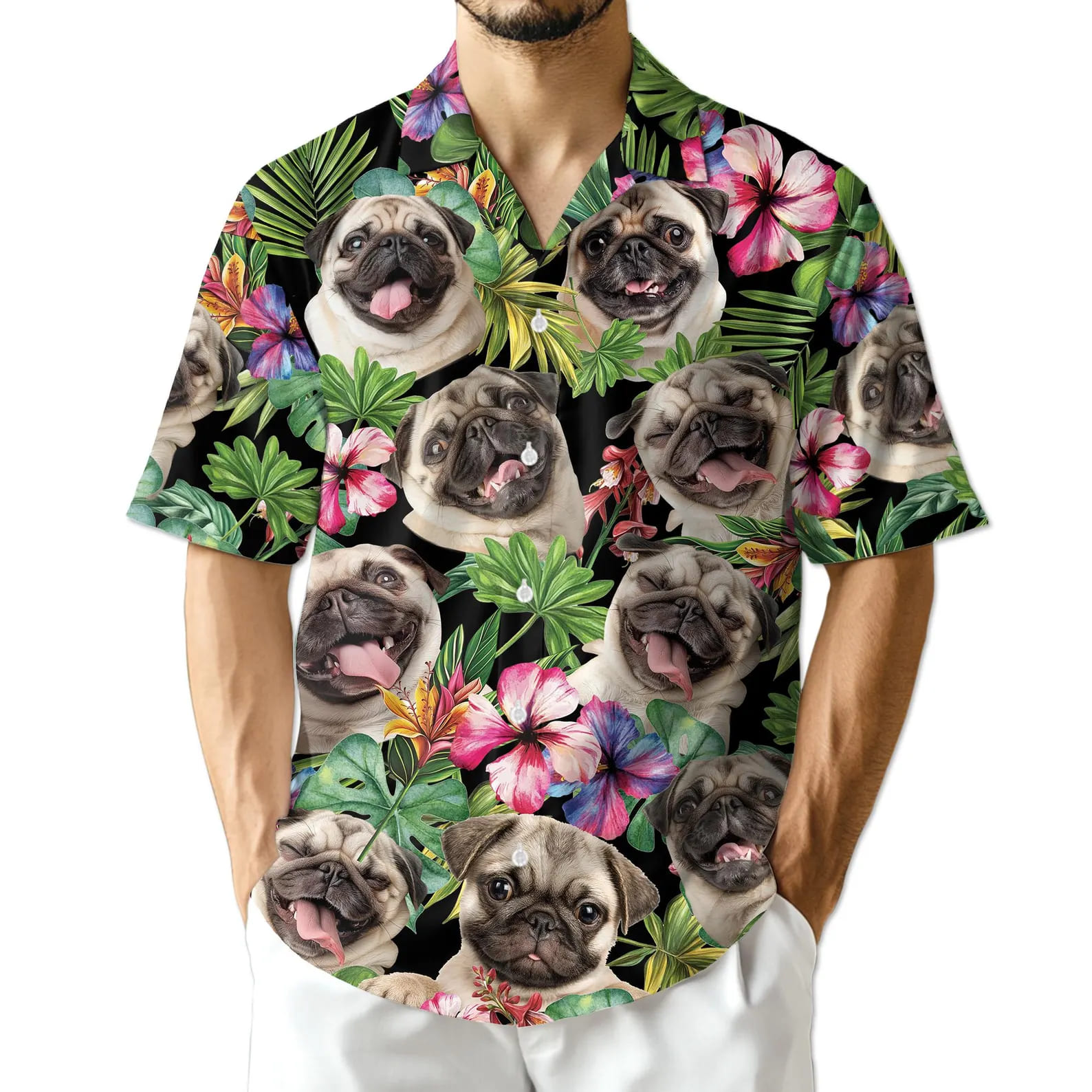 Unleash your inner beach dog with the Pug Hawaiian Shirt. This charming button-down features adorable, wrinkled pug faces nestled among vibrant tropical greenery and colorful hibiscus blooms. Made from premium, breathable fabric, it’s the ultimate “paws-itive” style choice for dog lovers, summer parties, and casual weekend strolls.