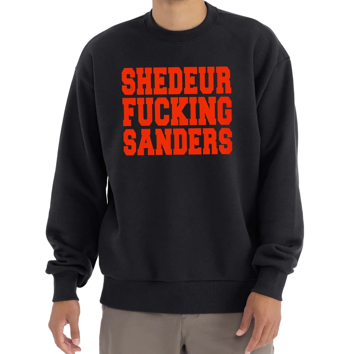 This t-shirt features a bold graphic style on a clean black base, with the phrase “SHEDEUR FUCKING SANDERS” printed in large, fiery red letters arranged vertically. The design delivers a powerful streetwear vibe that pairs easily with joggers or a jersey for a gameday outfit.
